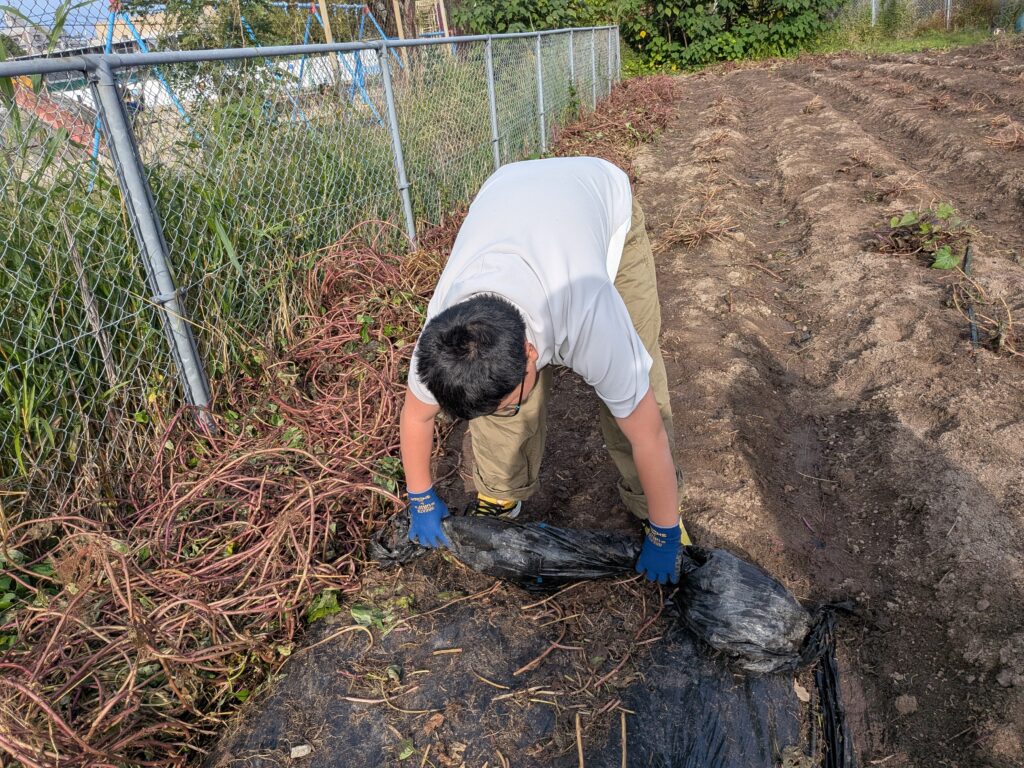 最初に保護者やお子さんたちと一緒に「マルチはがし(ビニールシート取り)」を行い、そのあといよいよお待ちかねの いもほりタイム!