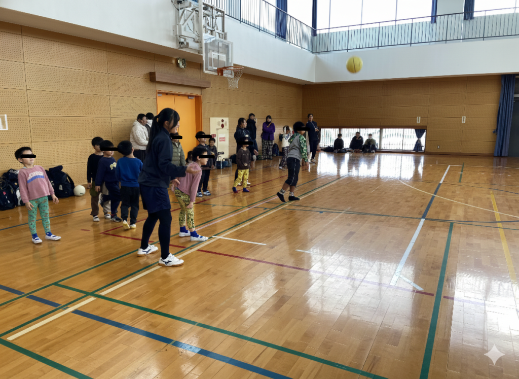 体育館では、筑紫高校の生徒さんによる「走り方・投げ方教室」が開かれました。優しく教えてくれる高校生に、最後には子どもたちが抱きついてしまうほど仲良くなる場面も!教わるという枠を超えた、心温まる交流が生まれていました。