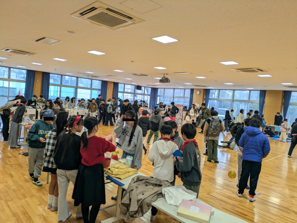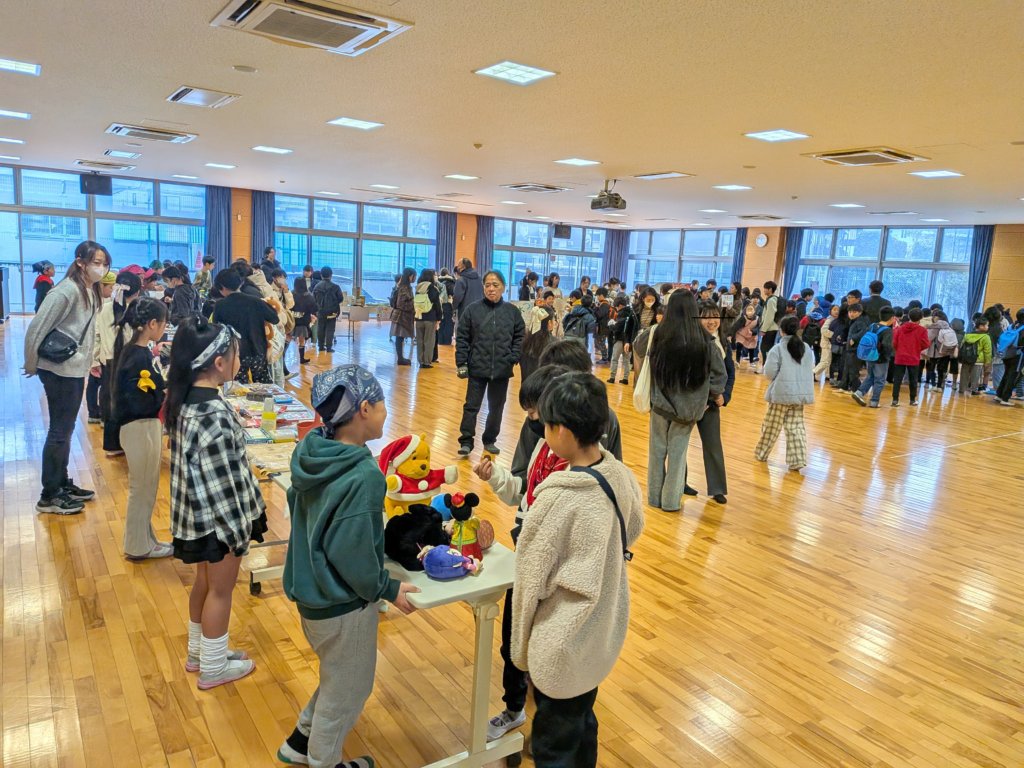 多目的室の「四年生バザー」では、元気いっぱいの呼び込みが響きました。状況を見て自分たちで値引きを始めるなど、商売の工夫を肌で感じる「生きた学び」の場となっていました。