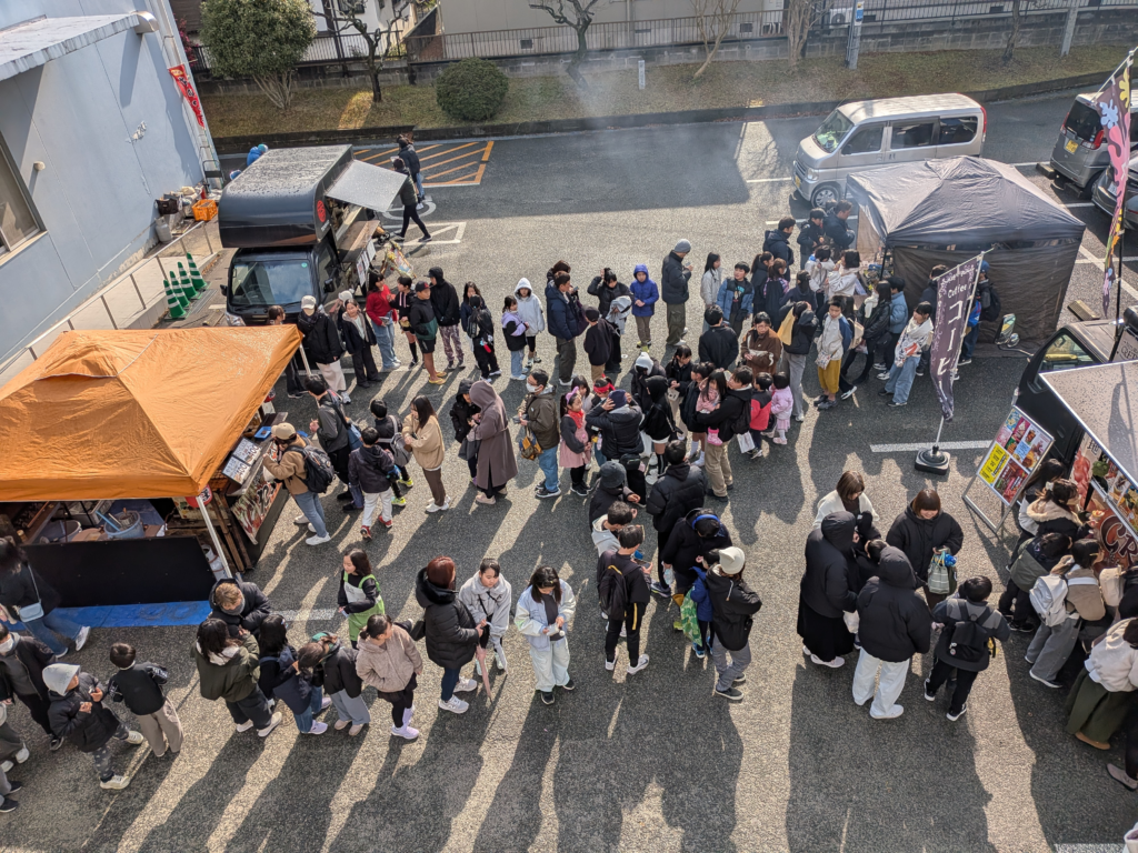 【屋外】大人気のキッチンカー 駐車場にはキッチンカーも登場!特にクレープは大人気で、寒さを忘れるほどの長い行列ができる盛り上がりを見せていました。