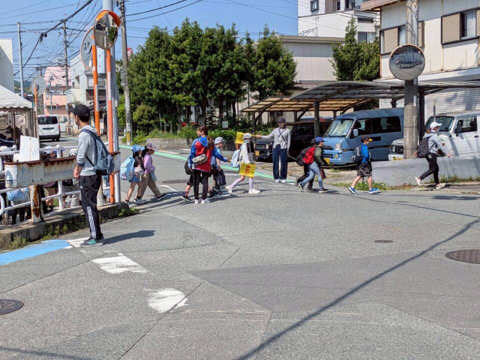 今回の遠足は、学年ごとに分かれて「天拝山公園コース」と「二日市公園コース」の2方面へ向かいました。 ボランティアスタッフは各コースの横断歩道や交差点に立ち、子どもたちが安全に渡れるよう旗振りや誘導を行いました。